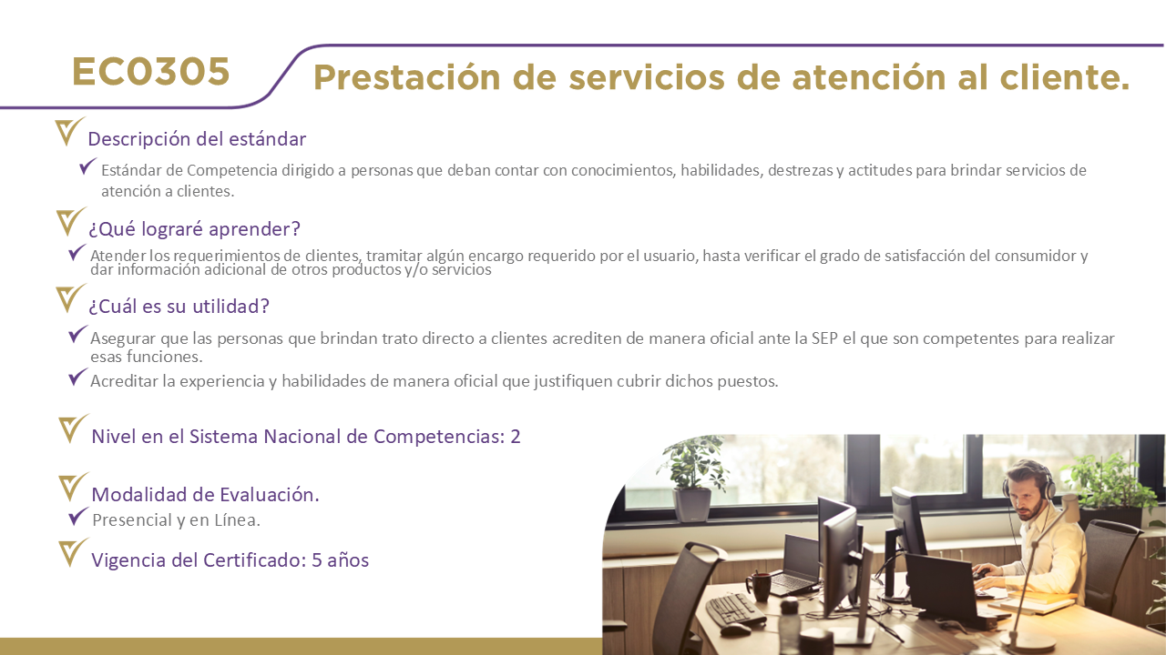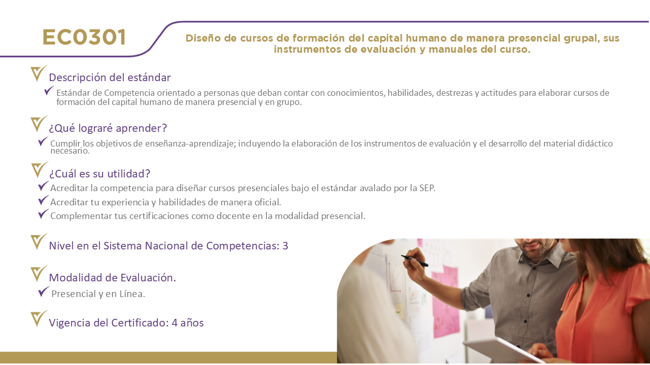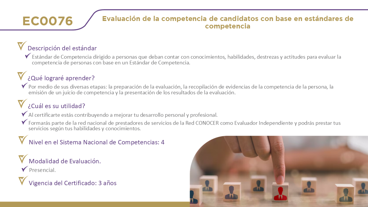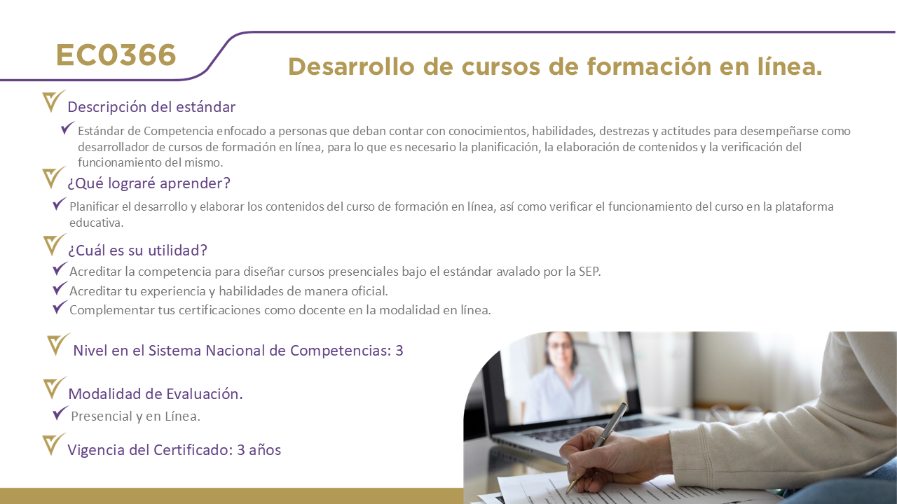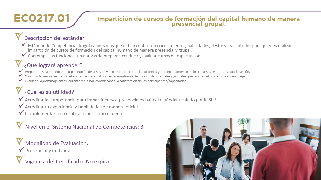 12 Certificaciones DisponiblesHaz clic en el nombre de cada estándar para obtener información detallada. EC0076, Evaluación de la competencia de candidatos con base en estándares de competencia. EC0366, Desarrollo de cursos de formación en línea. EC0217.01, Impartición de cursos de formación del capital humano de manera presencial grupal. EC0249, Proporcionar Servicios de consultoría general EC0301, Diseño de cursos de formación del capital humano de manera presencial grupal, sus instrumentos de evaluación y manuales del curso. EC0204, Ejecución de sesiones de coaching EC0160, Desarrollo de código de software EC0305, Prestación de servicios de atención al cliente EC0105, Atención al ciudadano en el sector público EC0518, Venta especializada de productos y servicios EC0401, Liderazgo en el servicio público EC1171, Garantizar el derecho a la protección de datos personales