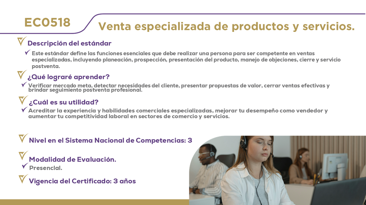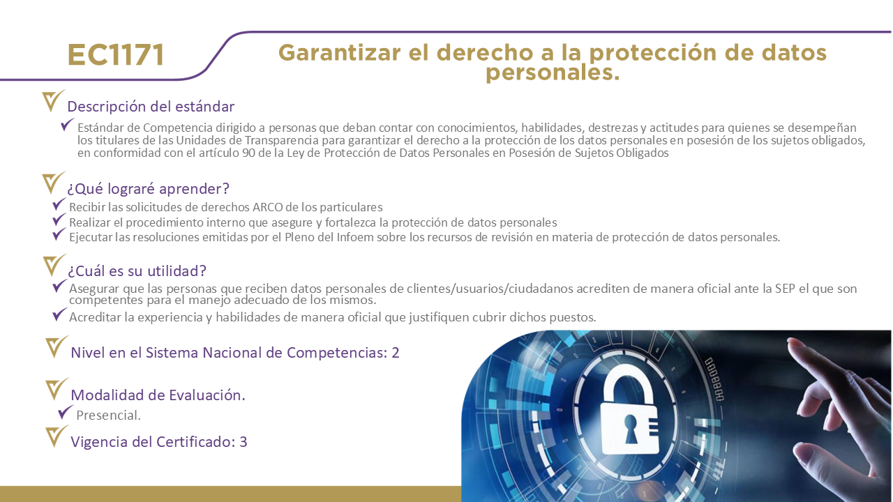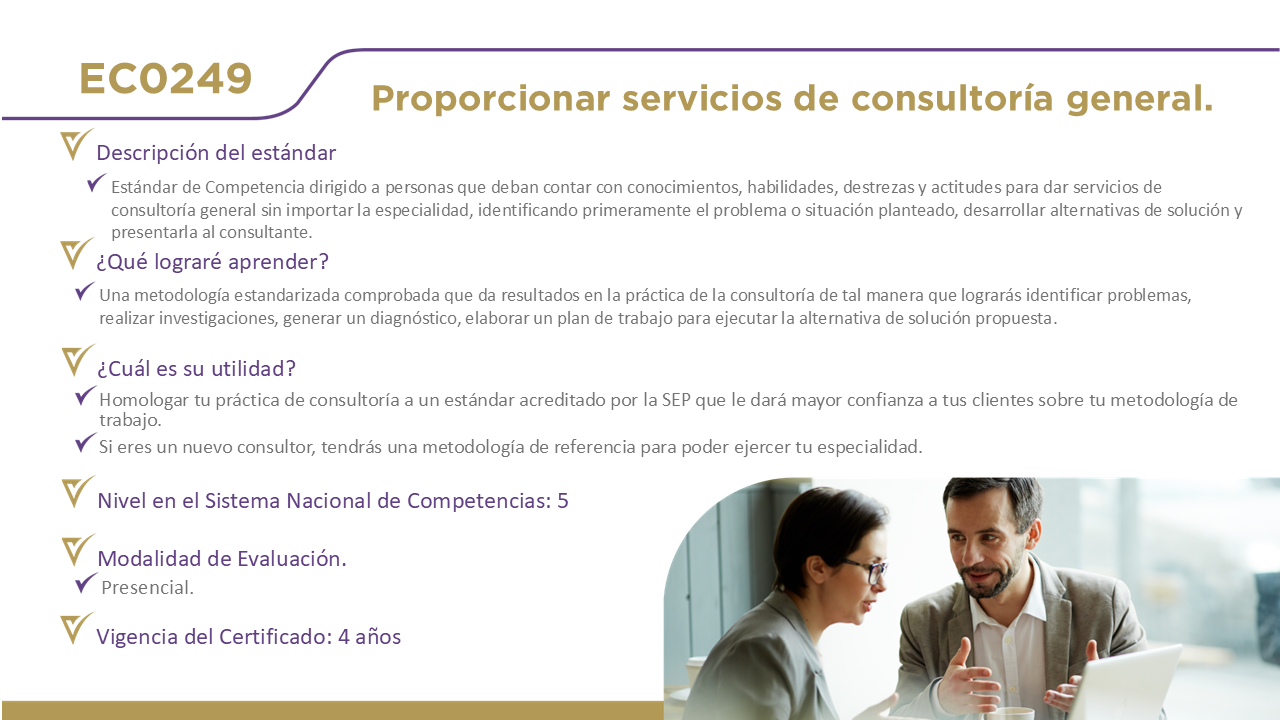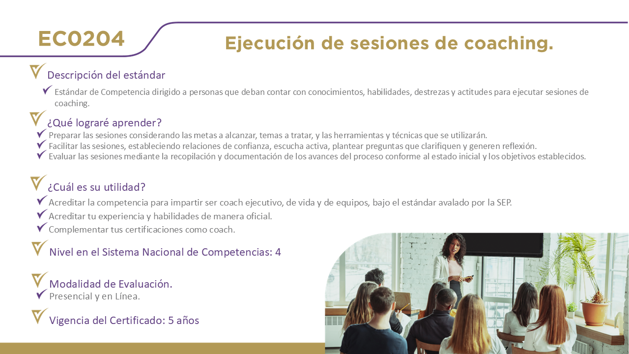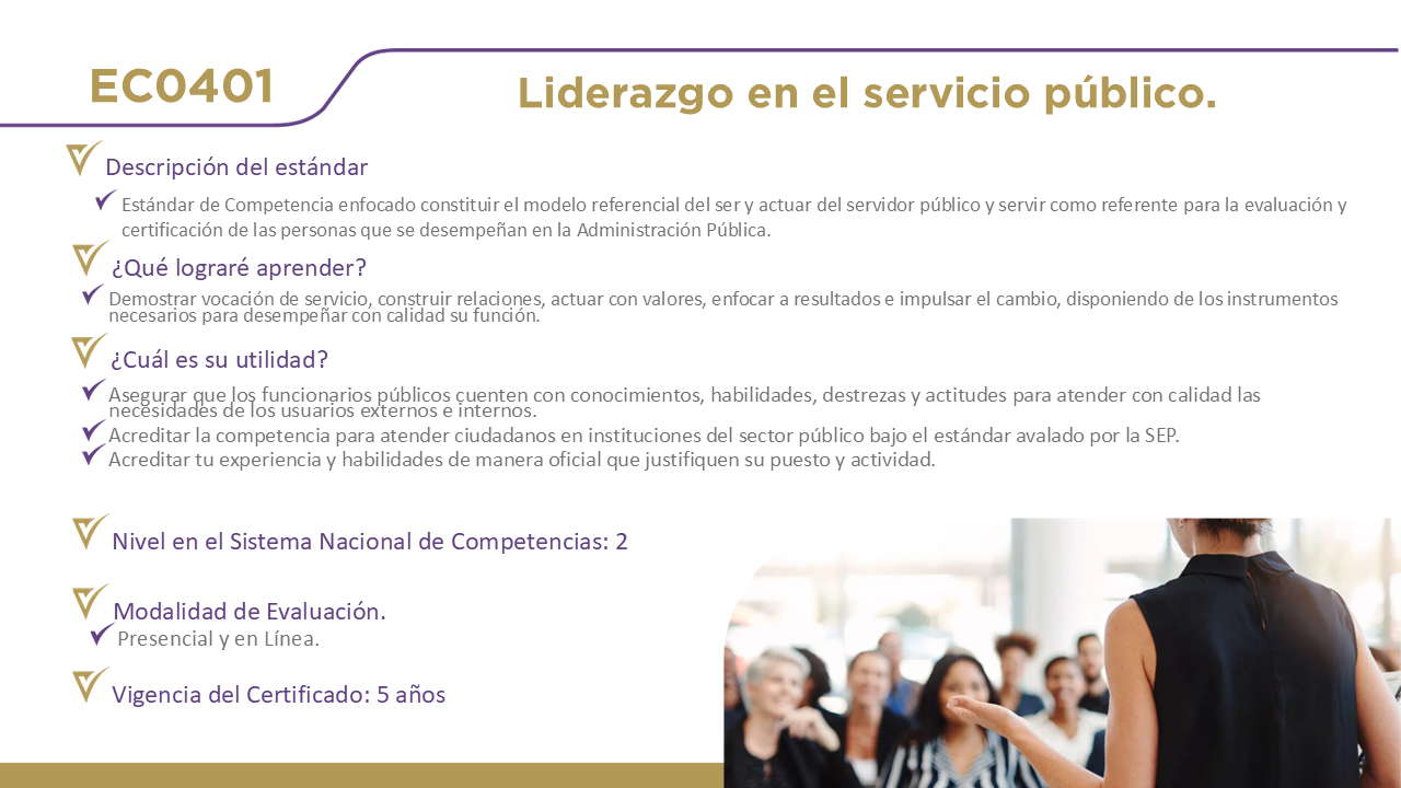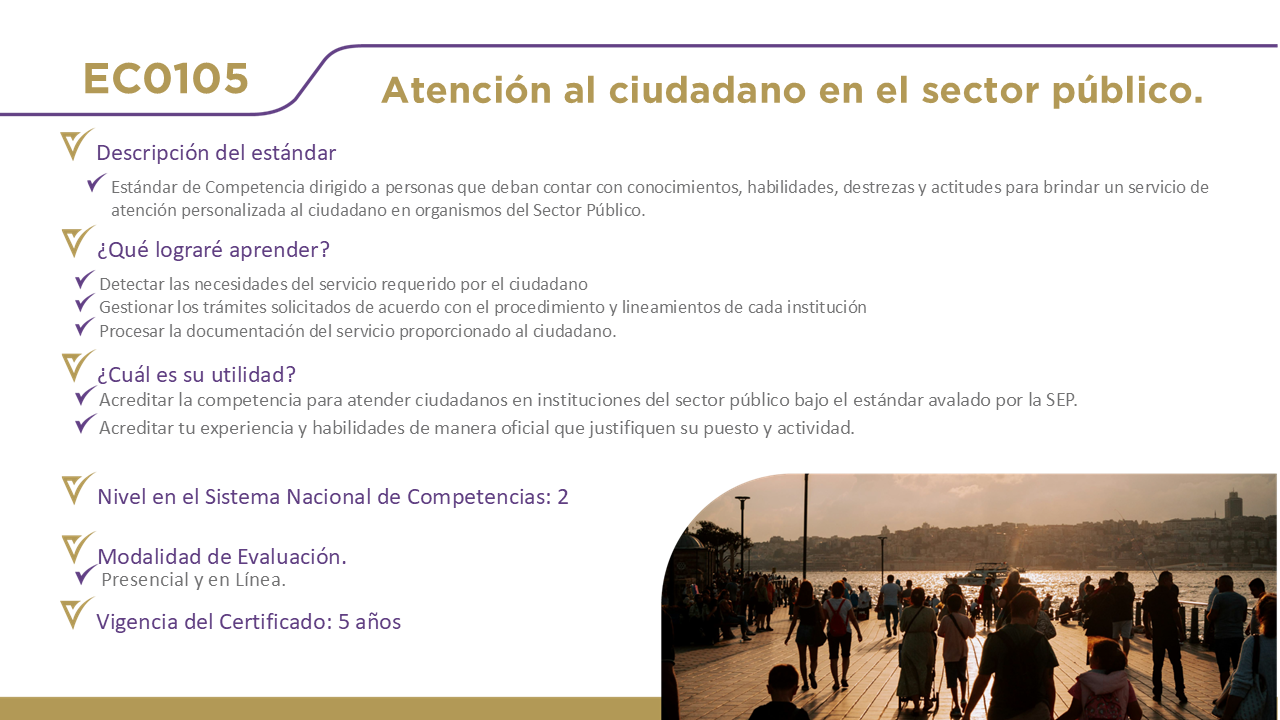 12 Certificaciones DisponiblesHaz clic en el nombre de cada estándar para obtener información detallada. EC0076, Evaluación de la competencia de candidatos con base en estándares de competencia. EC0366, Desarrollo de cursos de formación en línea. EC0217.01, Impartición de cursos de formación del capital humano de manera presencial grupal. EC0249, Proporcionar Servicios de consultoría general EC0301, Diseño de cursos de formación del capital humano de manera presencial grupal, sus instrumentos de evaluación y manuales del curso. EC0204, Ejecución de sesiones de coaching EC0160, Desarrollo de código de software EC0305, Prestación de servicios de atención al cliente EC0105, Atención al ciudadano en el sector público EC0518, Venta especializada de productos y servicios EC0401, Liderazgo en el servicio público EC1171, Garantizar el derecho a la protección de datos personales